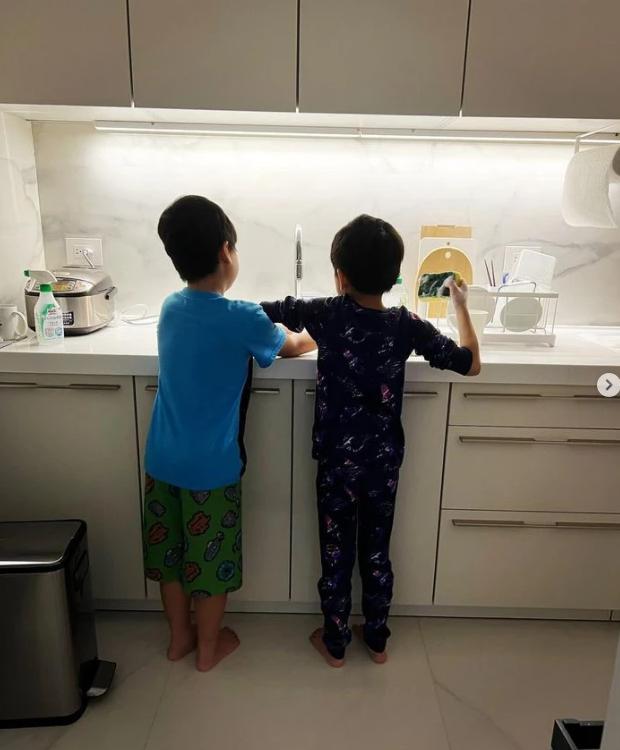 新浪娱乐讯 近日,林志颖妻子陈若仪晒出自己的日常小确幸,陪林志颖复建,带双子星儿子游玩,画面中双子星还帮妈妈洗碗分担家务,满满的都是幸福感。
