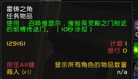 那么要怎么召唤神龙摧毁风暴之翼传送门呢?答案看这里,首先打开背包,有装背包插件的同学可以直接在搜索栏输入雷铸之角,然后任务道具就会高亮了,没有的同学只好自己找一下了,道具图标如图所示。