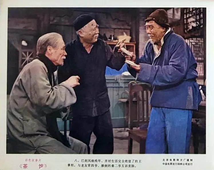 演职人员牛——导演谢添,1936年经“电影皇后”胡蝶引荐踏入影坛,和袁牧之、周璇、赵丹合作过影史留名的《马路天使》。饰演王利发的于是之,被评为“中国电影百位优秀演员”;饰演常四爷的老艺术家郑榕,曾随《茶馆》剧组赴西德、法国和瑞士等国家演出;饰演松二爷的黄宗洛是黄金配角,曾参演《我爱我家》、《水浒传》等名作;饰演“秦二爷”的蓝天野,于今年6月刚刚过世,曾在《封神榜》中饰演仙风道骨的姜子牙,《渴望》中扮演王沪生那=温文尔雅的老父亲;饰演“刘麻子”的英若诚,是满族正红旗出身,其祖父英敛之(赫舍里氏)是清末文化名人,曾创办《大公报》,后又创办了与清北齐名的辅仁大学。