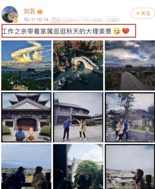 10月11日,刘芸在社交平台上更新一则动态,与大家分享她的近况,并配文称:“工作之余带着家属逛逛秋天的大理美景。”