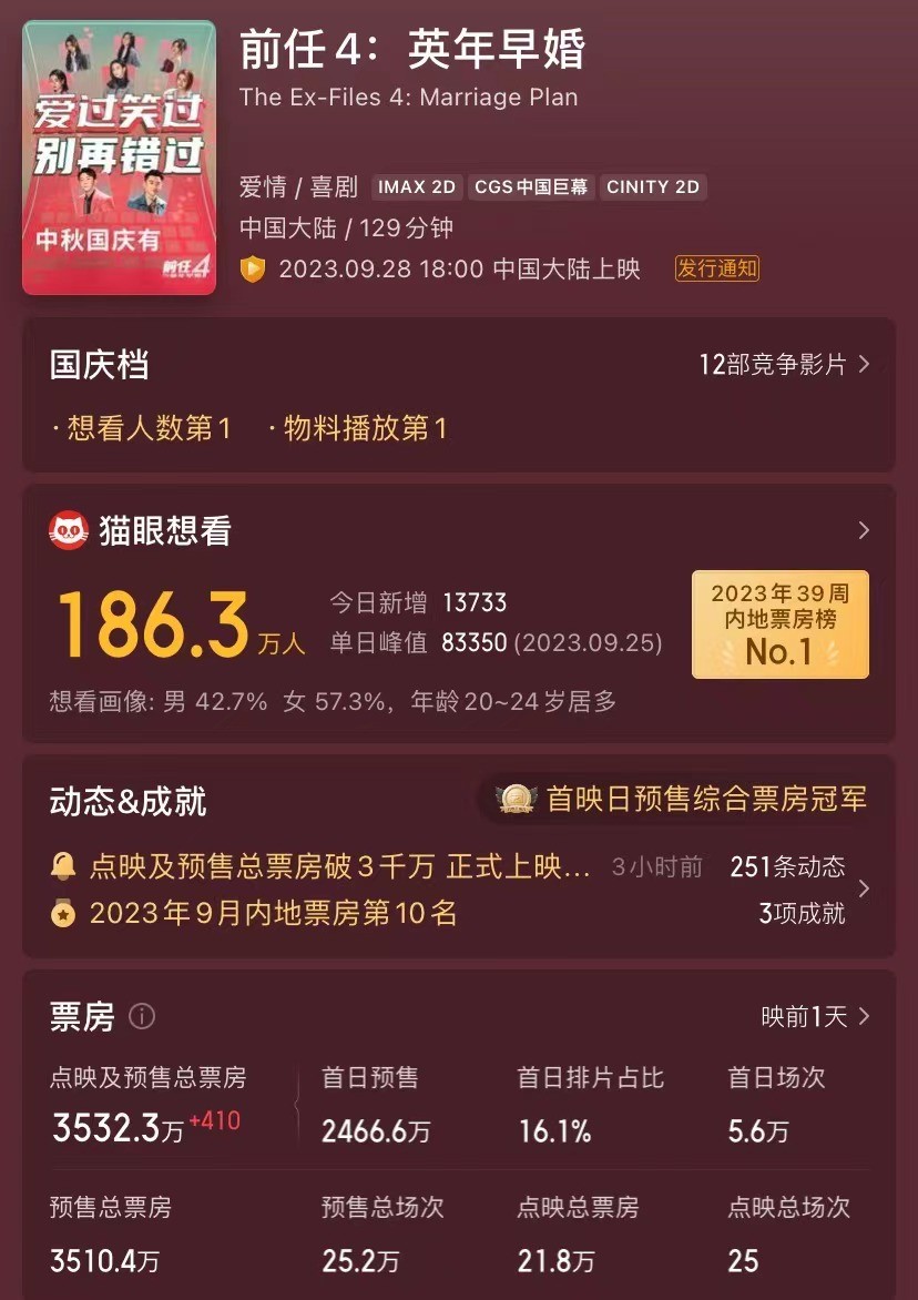 从当前的数据来看,整体今年的国庆档电影预售都有点差强人意,并没有达到去年的火热程度。从点映效果来看,只有《好像也没那么热血沸腾》开启了超前三天点映,其他几部电影都没有开点映,还挺让人意外的。