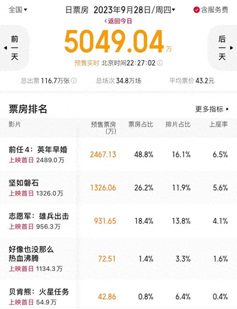 2023国庆档电影预售票房排名:志愿军垫底,坚如磐石有望逆袭