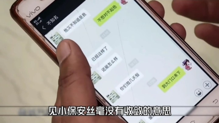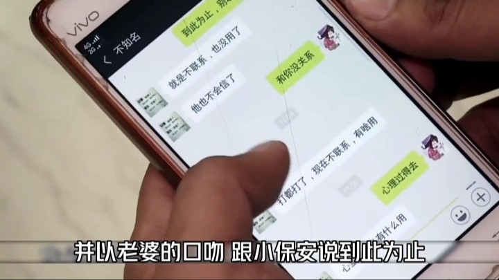 男子说你此时还在狡辩,那你今天早上给我发了什么?原来男子用自己的手机登录了他老婆的微信冒充他老婆跟小伙聊天,男子越说越是激动,但保安小伙却一脸无所谓。