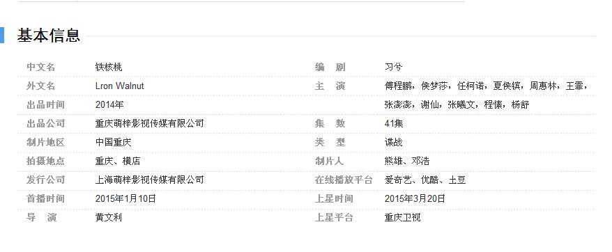 《铁核桃》是重庆萌梓影视传媒有限公司出品,由黄文利执导,傅程鹏、侯梦莎、任柯诺、夏侯镔、张澎澎、王霏主演的谍战剧 。