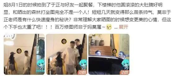 近日,有八卦媒体拍到于正与好友一起聚餐,下楼梯时他的大肚腩十分明显,和于正社交账号种晒出的森林打坐图完全不是一个人。于是,该八卦媒体发文嘲讽道:" 短短几天就变得那么苗条帅气,莫非于正老师是有什么快速瘦身的秘诀?非常理解大家晒图的时候想变更美的心情,但这个下手也太重了吧!!!百万修图师非于妈莫属~"。