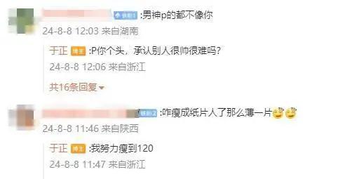 此前,于正在社交平台上晒照被质疑 P 图。有网友留言称:" 男神 p 的都不像你 ",对此,于正回怼道:"P 你个头,承认别人很帅很难吗?"