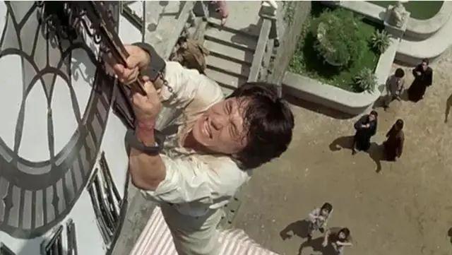时间扳回到 1983 年,成龙自导自演《A 计划》,其中有一个危险镜头:从 15 米高的钟楼上跳下来。当时成龙连续去片场六天,都不敢往下跳,直到第七天被洪金宝一顿臭骂,才下定决心一跃而下,最终颈骨重伤,鼻骨撞裂。
