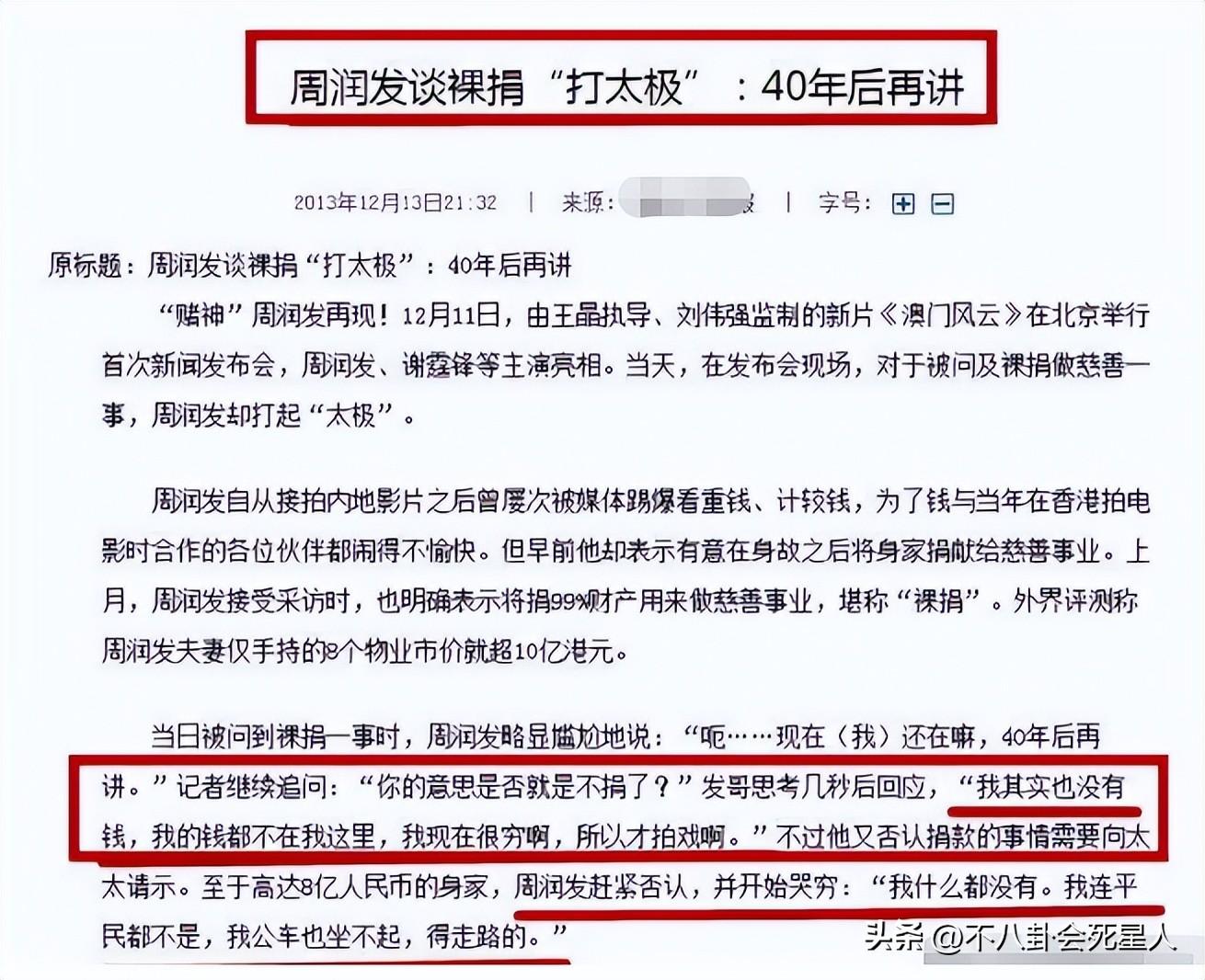 在《澳门风云》的发布会上,当记者问起裸捐一事时,周润发又打起了马虎眼,称40年后再提,而且从来没有为救灾、公益等方面捐过款。