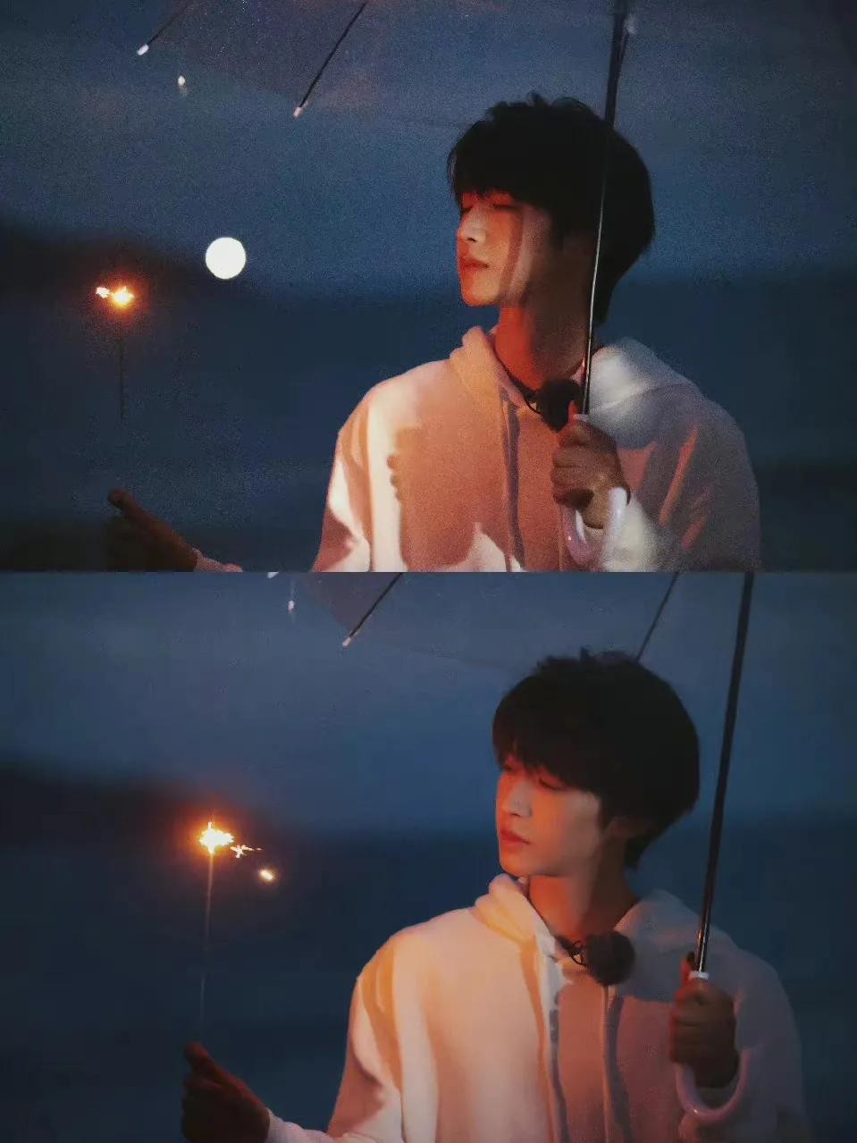 刘宇这个也是极具氛围感呀,烟花加雨伞,这两个都非常有氛围感的搭配,一起用简直就是偶像剧男主。