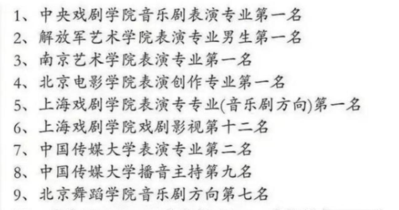 和很多艺术生一样,张新成高三上学期参加了很多艺术考试,并且参与了九所艺术院校的报考,结果出来以后大家可都惊呆了,因为这名学生总共参加了九所艺术学院的报考,就在五所学院的艺术考试中取得第一名,其中就包括中央戏剧学院、解放军艺术学院、南京艺术学院、以及北京电影学院等艺术院校。