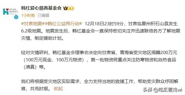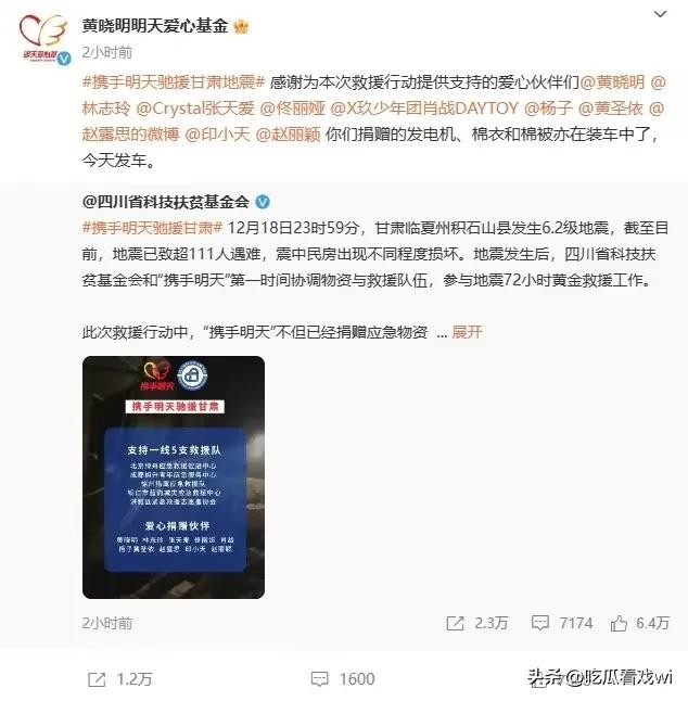 韩红、黄晓明等明星为甘肃地震捐款捐物,传递正能量"