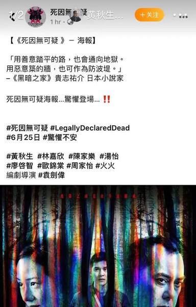 黄秋生为什么有如此反常的行为?原来他主演的电影《死因无可疑》6月25日上映。影片还有林嘉欣、陈家乐、汤怡等加盟,算是小成本制作。但对于许久没工作机会的黄秋生来说很重要。