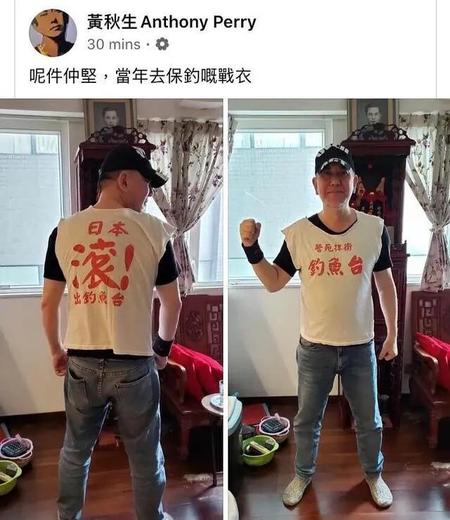 接着又晒照,穿着当年参加保卫钓鱼岛活动时穿的服装,换了一副笑眯眯的嘴脸,摆了两个造型。