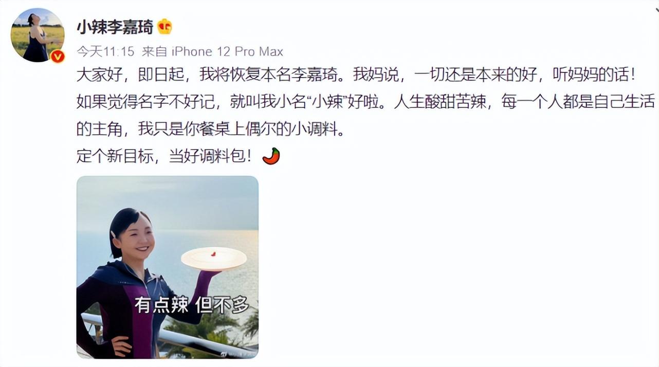 此外,辣目洋子还表示倘若大家记不清她的本名,大家还可以叫她的小名“小辣”,当下辣目洋子还将其微博ID正式更正,取名为“小辣李嘉琦”,随后还特别解释了“小辣”一名的寓意,人生酸甜苦辣,每个人都是自己生活的主角,而自己仅仅是大家餐桌上的小调料。