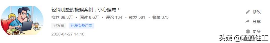 隆鑫住工小编在轻钢别墅的被骗案例,小心骗局!, 阅读 超过了8.6万 评论 134 转发 581 收藏 375 收到了众多粉丝朋友的私信以及留言,所以针对于目前市场出现的乱象情况,推出了第二期的《轻钢别墅的被骗案例,小心骗局第二期!》,希望我们的客户朋友在签订合同交易过程中保持该有的谨慎,防止上当受骗!