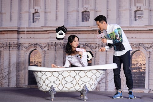 发布会现场上,饰演女主角尹夏沫的黄灿灿出场方式也是很是独特,她在装满泡沫的浴缸中被四名男模抬上舞台。随后,主持人让罗仲谦为黄灿灿用其道具“搓背”,不过刚刚拿到“熊掌”道具的罗仲谦就在那里自言自语:“这个道具怎么看起来色色的。”主持人抓住时机,调侃道:“果然什么人看什么东西就是什么样子。”