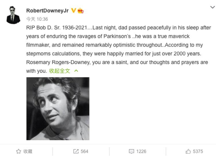 今天,小罗伯特·唐尼在社交网络上发文悼念父亲,“昨晚,我的父亲在睡梦中安详去世,在经历了多年帕金森症的困扰之后。他是一个真正特立独行的电影人,在任何时候都保持乐观。”