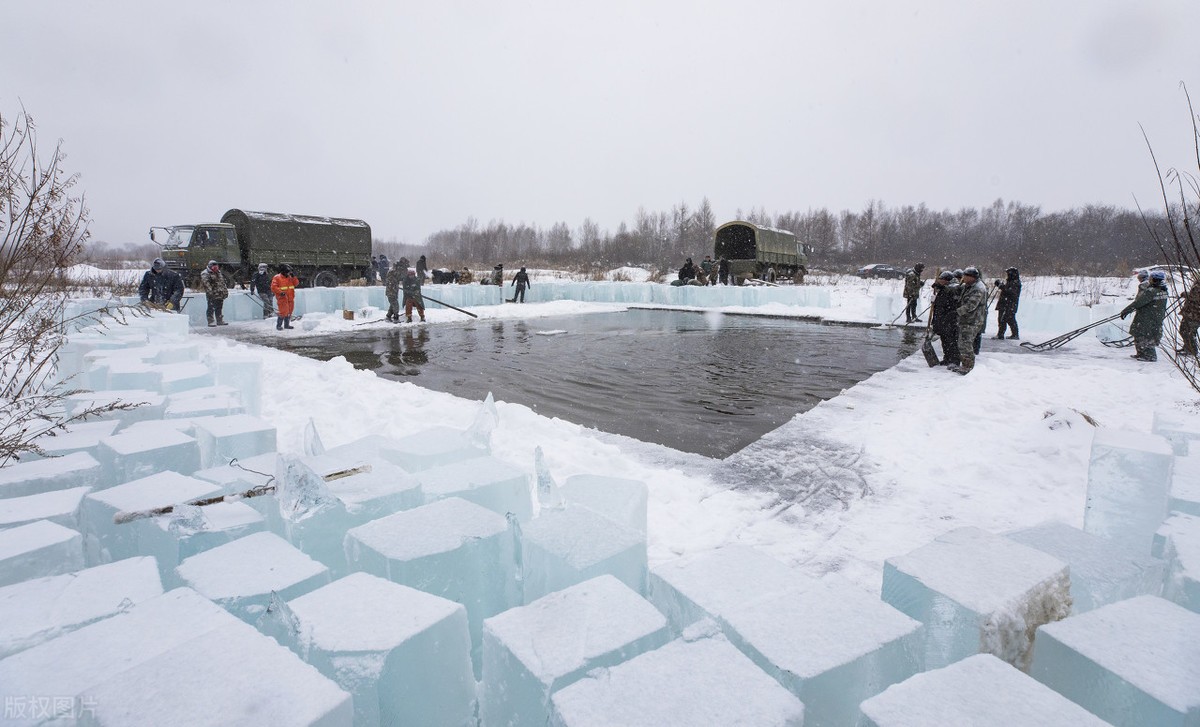 在雪橇上装上两把平行的冰刀,用马来拖拽。冰刀上有锯齿,所以会在冰面上留下很深的槽沟,反复进行就可以切开坚固的冰面,把冰块切成棋盘状。最后再用少量人力把冰块挖出即可。