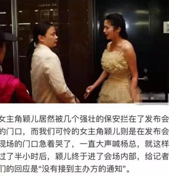 当时初出茅庐的颖儿急得在门口大哭,作为女主角的颖儿,顿时风度尽失,急喊“杨总救我”。杨子在半个小时之后姗姗来迟,虽然颖儿后面也成功入场,但却为颖儿留下了非常大的负面影响。