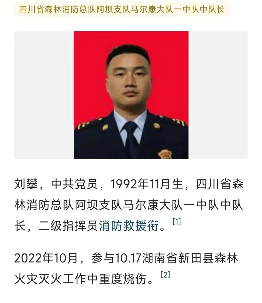 刘攀,一名中共党员,四川省森林消防总队阿坝支队的中队长。他的勇气和英雄精神在湖南省永州市新田县特大森林火灾中得到了彰显。大火蔓延,刘攀带领队伍奋不顾身,但在火场中遭受了重度烧伤。这位英勇的消防战士在昏迷50多天后,通过一百多天的艰苦抢救,终于脱离了生命危险。