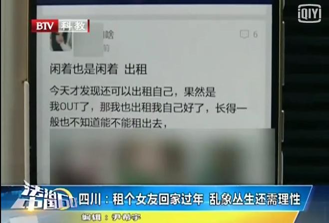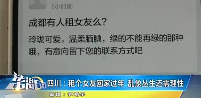 在交谈中,女子告诉记者,她自己的老家在成都某郊县,目前在成都某公司上班。由于害怕父母逼婚,春节她并不想回家,于是就想到将自己出租出去。