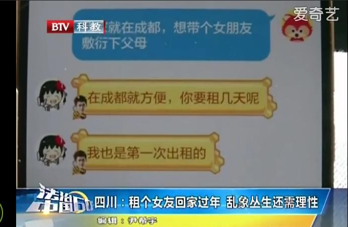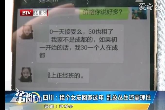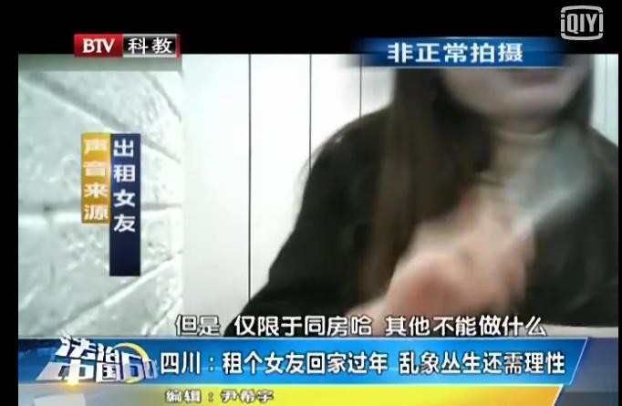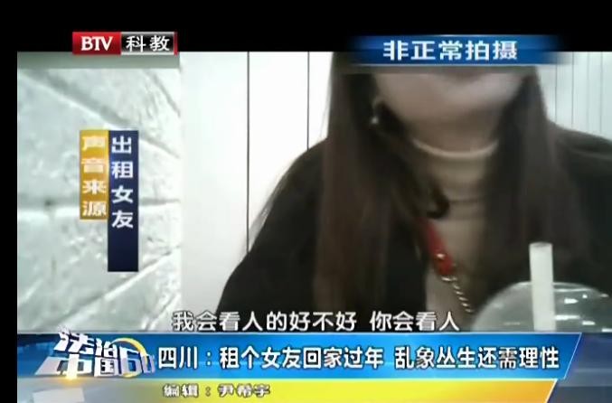 春节前夕,网络上的多款软件都推出了出租女朋友的业务。据了解,这些出租自己的女孩,都是在婚介所正规登记的,起价三千元。并且,这些所谓的出租女友还可以同居。针对这种乱象记者进行了调查。