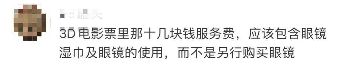 多位网友留言称,3D电影本来就比普通电影要贵,但是现在电影院不提供免费眼镜,观众不得不购买付费眼镜,无形中增加了票价。