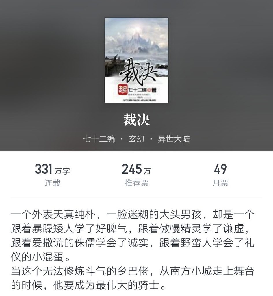 新书《裁决》上线后,反响不错,读者非常的追捧,如果能保证更新说不定又是一个传奇的作品,可惜不知道是作者江郎才尽还是琐事缠身(猜测无贬低),这本作品在后面更新不尽人意,这一点最为致命!