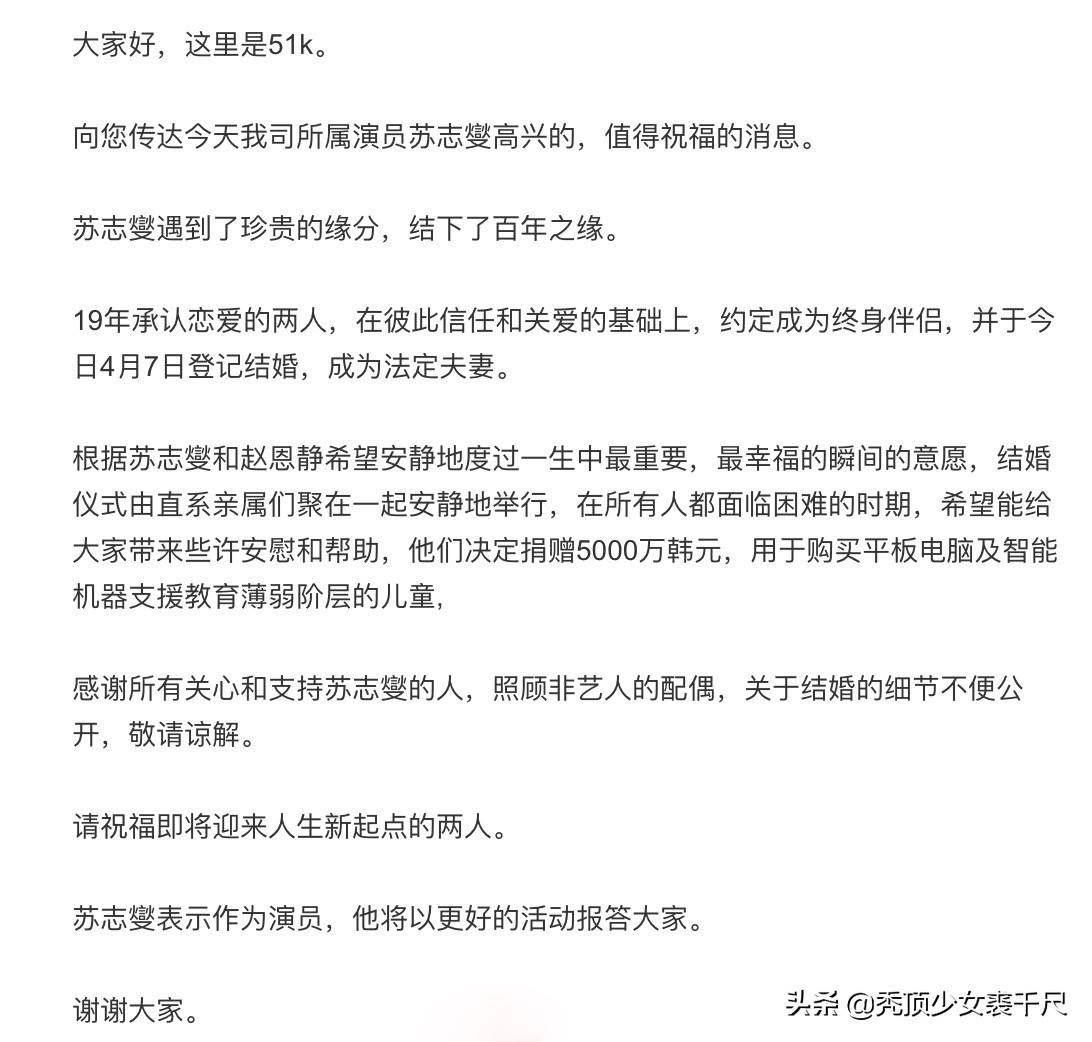 4月7日,苏志燮所属社51k公布了苏志燮与赵恩静的结婚喜讯,并表示:“苏志燮遇到了珍贵的缘分,结下了百年之缘。19年承认恋爱的两人,在彼此信任和关爱的基础上,约定成为终身伴侣,并于今日4月7日登记结婚,成为法定夫妻。”