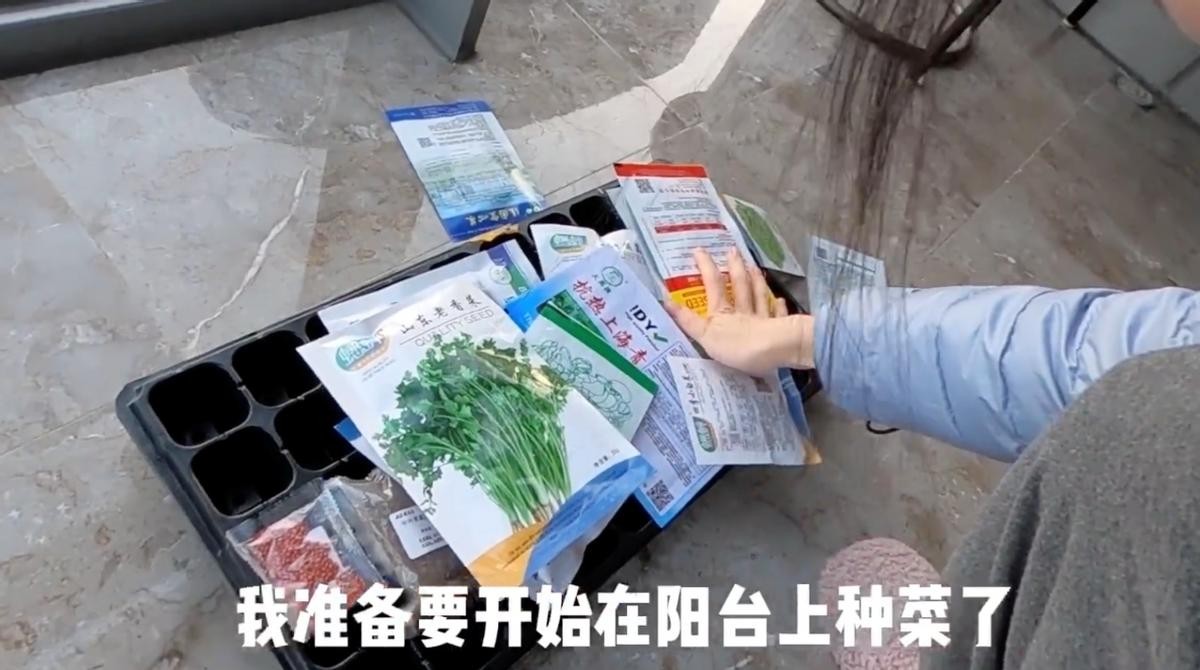 确实,在这样的一段时间里闲着也是闲着,还不如开发一下自己的新技能呢。苗苗表示在这个时候种菜一方面是可以满足家庭需要,另一方面也是希望有更多的人看到之后不必为现在的状况焦虑,可以选择去做一些其它的事情转移注意力。可以看到她为了种菜还是买了很多的菜种子以及一些营养土,同时自己还配上了种菜可以用到的石头。当天的她蹲在电梯门的后面,认真地讲解着自己此次购买的物品。