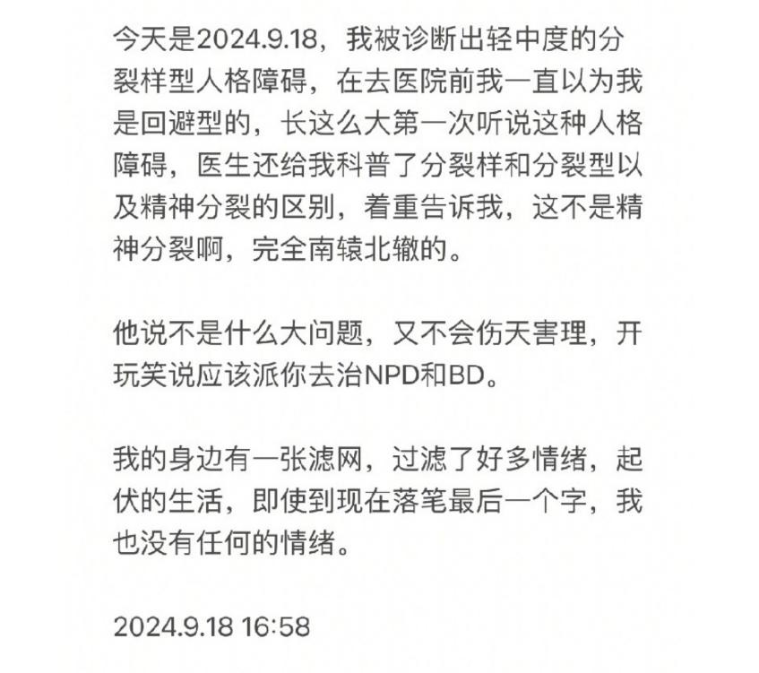 近日,歌手沈以诚因不满粉丝在其评论区开玩笑而清空动态,并发文透露自己被诊断出轻中度的分裂样型人格障碍,引发热议。