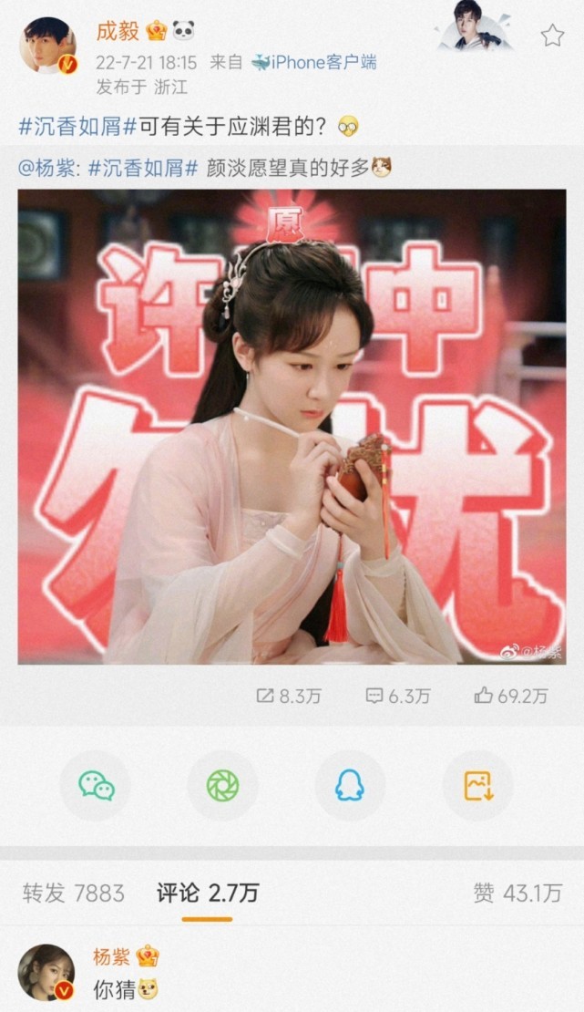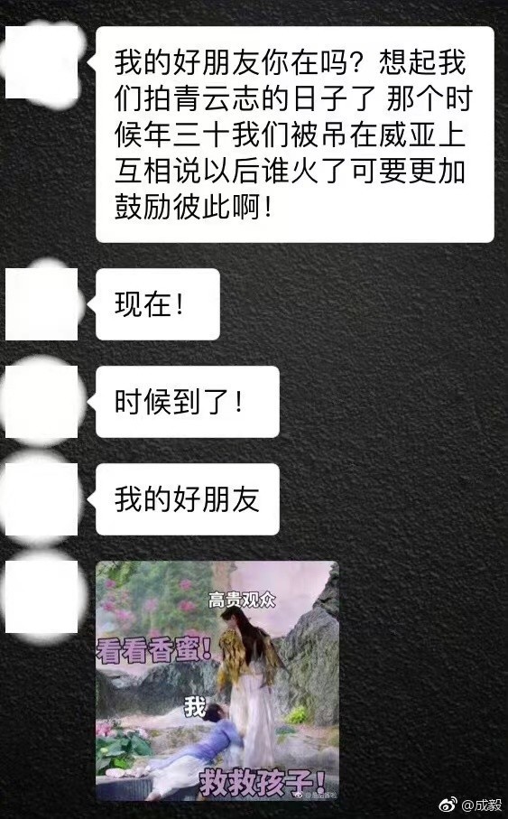 当时为了宣传《香蜜》定档播出,杨紫非常拼,请了很多娱乐圈明星好友帮忙宣传。其中,成毅也发了微博为杨紫宣传《香蜜》。杨紫在聊天记录中提到,想起我们拍《青云志》的那些日子了,那个时候年三十我们被吊在威压上互相鼓励说,以后谁火了可要更加鼓励彼此啊。