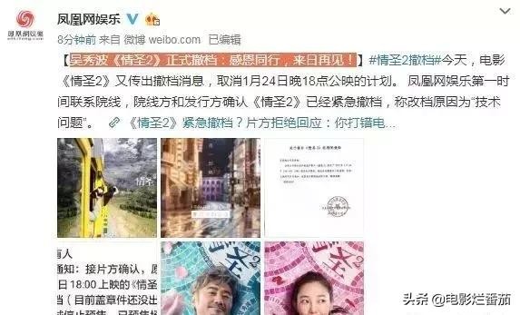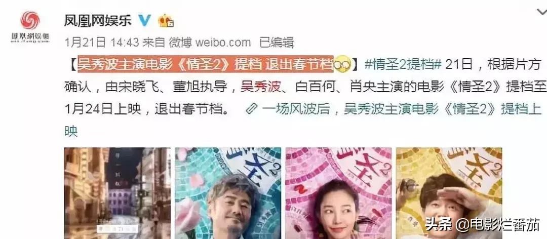 由白百何、吴秀波等主演的电影《情圣2》原定于大年初一上映,但是因为吴秀波这起风波的发酵,该片在1月21日确认提档到1月24日晚18点上映。