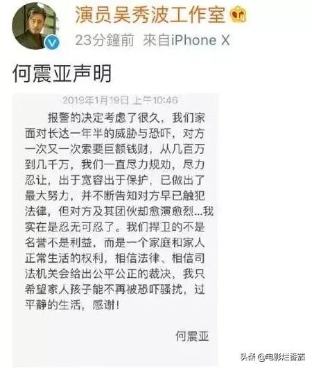因此2019年1月19 日,何震亚(吴秀波妻子)出面通过吴秀波工作室发布声明。