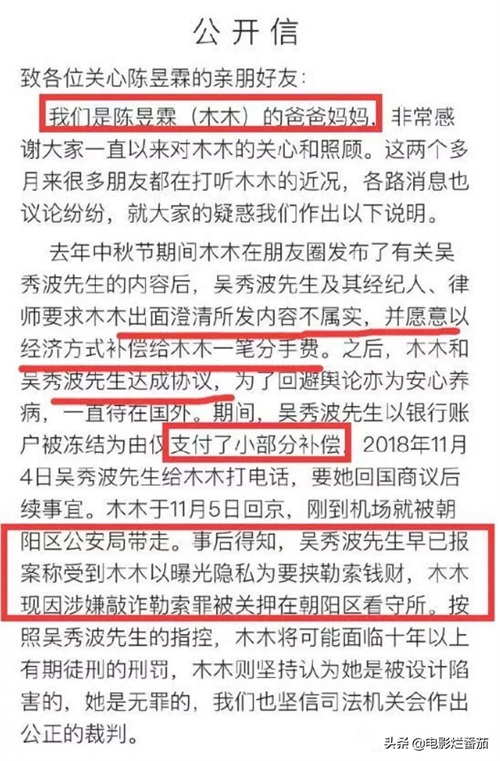 信中称因为吴秀波向公安报案陈昱霖以曝光隐私为要挟勒索钱财,所以陈昱霖目前已因涉嫌敲诈勒索罪被关押在朝阳区看守所。