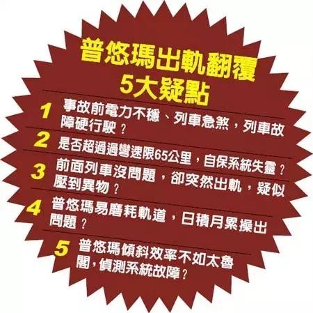 1. 事故前电力不稳、列车急刹,列车故障还硬行驶?2. 是否超过过弯速度限制(65公里/小时),自动保护系统失灵或被关闭?3. 上一班列车通过没问题,普悠玛却突然出轨,疑似压到异物?4. 普悠玛易磨耗轨道,日积月累攒出问题?5. 普悠玛倾斜效率不如太鲁阁,侦测系统故障?