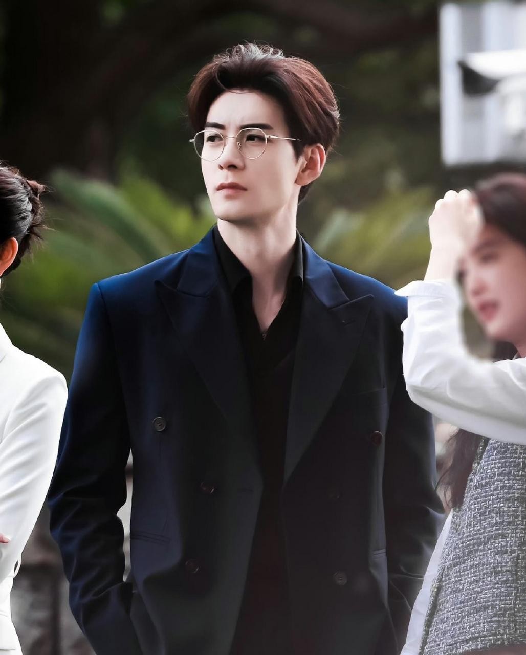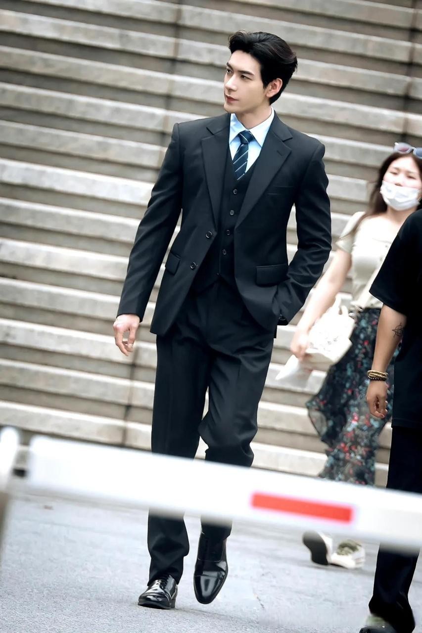 西装加身,宽肩窄腰,身姿挺拔。