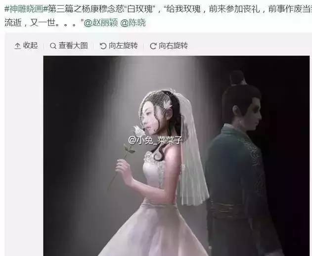 最后的互动,依然是神雕晓画。我觉得陈晓将杨康画得好渗人,赵丽颖也画得不像。我对这幅画的理解是一首分手的挽歌。歌词是陈奕迅的《白玫瑰》。杨康已死,穆念慈已经转世。再无交汇的可能。白玫瑰的灵感来源详见最上面那幅图,根据网友爆料,此时二人已经分手几个月了!