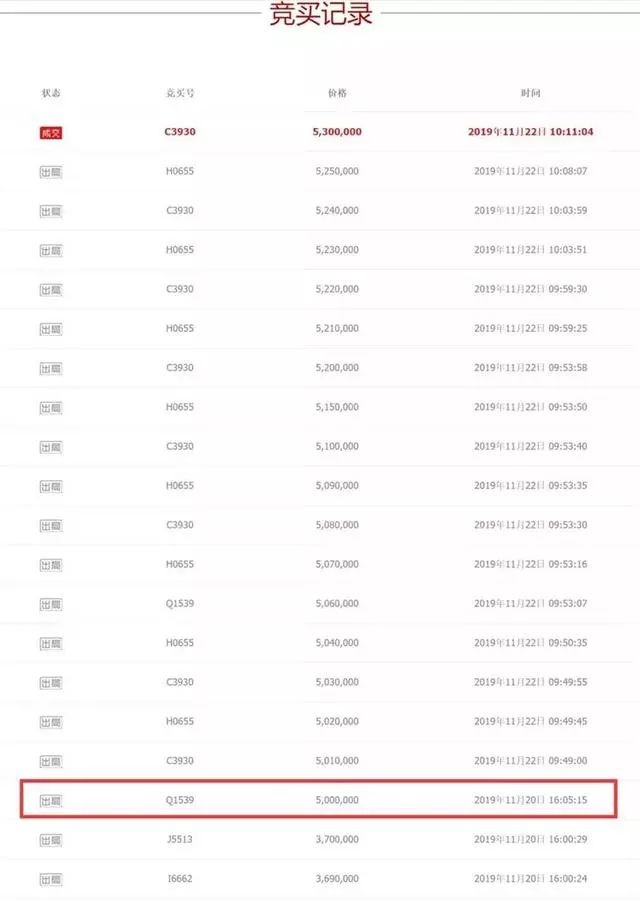 值得一提的是,其中一名买家在一次叫价中,直接从370万元叫到了500万元,整整高出了上一轮130万元。不过这名买家最后一次叫价定格在了506万元,此后再没出价。