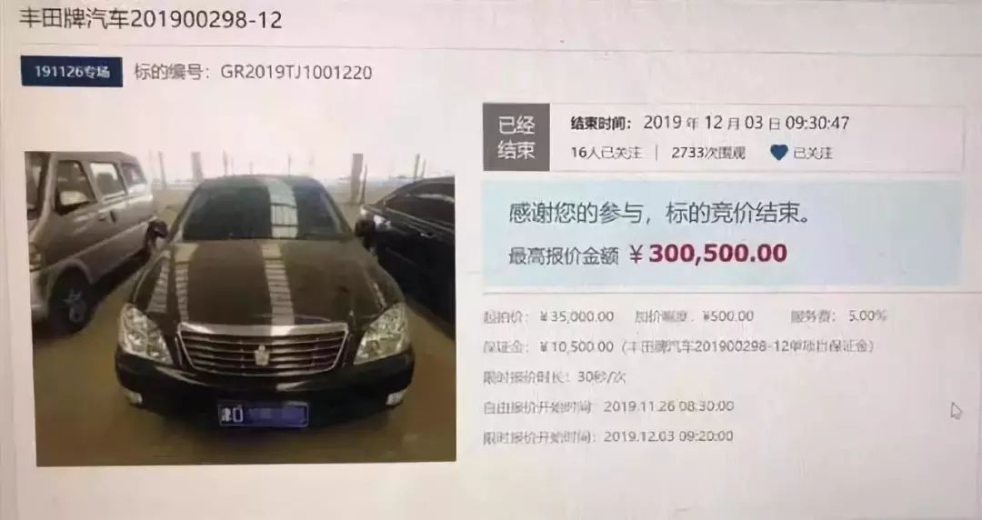 近日在一次拍卖中,一辆2007年4月初次登记上牌的皇冠3.0车型,表显里程仅为7983公里,是一辆公务车。其起拍价为3.5万元,每次出价不能低于500元,最终却以30.05万元的超高价格结束了拍卖。