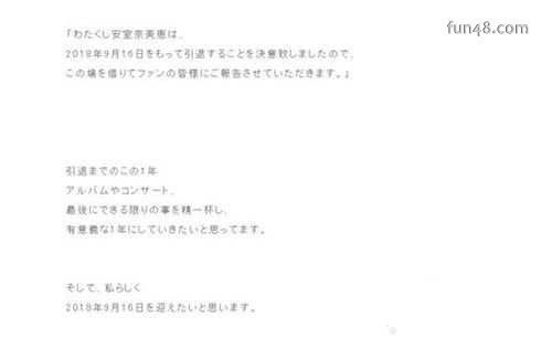 在她发布的这封声明当中,安室奈美惠首先对25年以来一直支持自己的粉丝表示了感谢。安室奈美惠表示,如果没有粉丝们的支持自己也没有办法走到现在。她还在这次的通告当中确认自己将于2018年9月16日,即出道26周年纪念日当天正式隐退。在离隐退还有一年的日子里,自己将会在自己能力范围内为演唱会和专辑努力,度过有意义的一年。