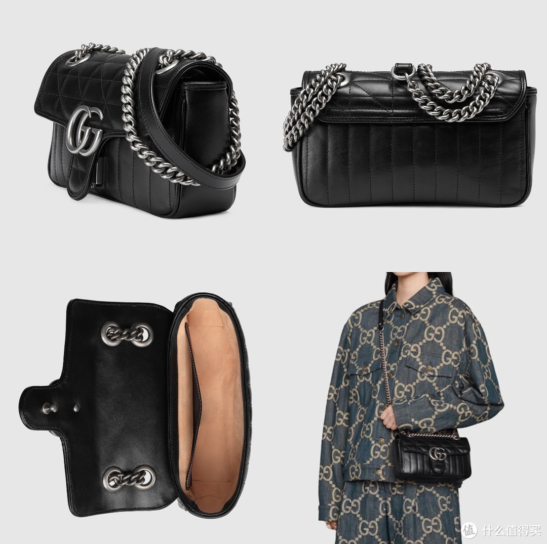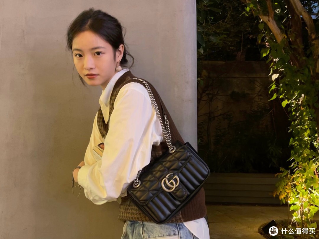 Gucci最经典的马蒙系列链条包,李庚希没有背比较火的那只黑金,而是选了黑银全新绗缝款,个性的绗缝皮革,搭配标志性双G金属扣,日常比较经典好搭配,通勤、约会背都合适。