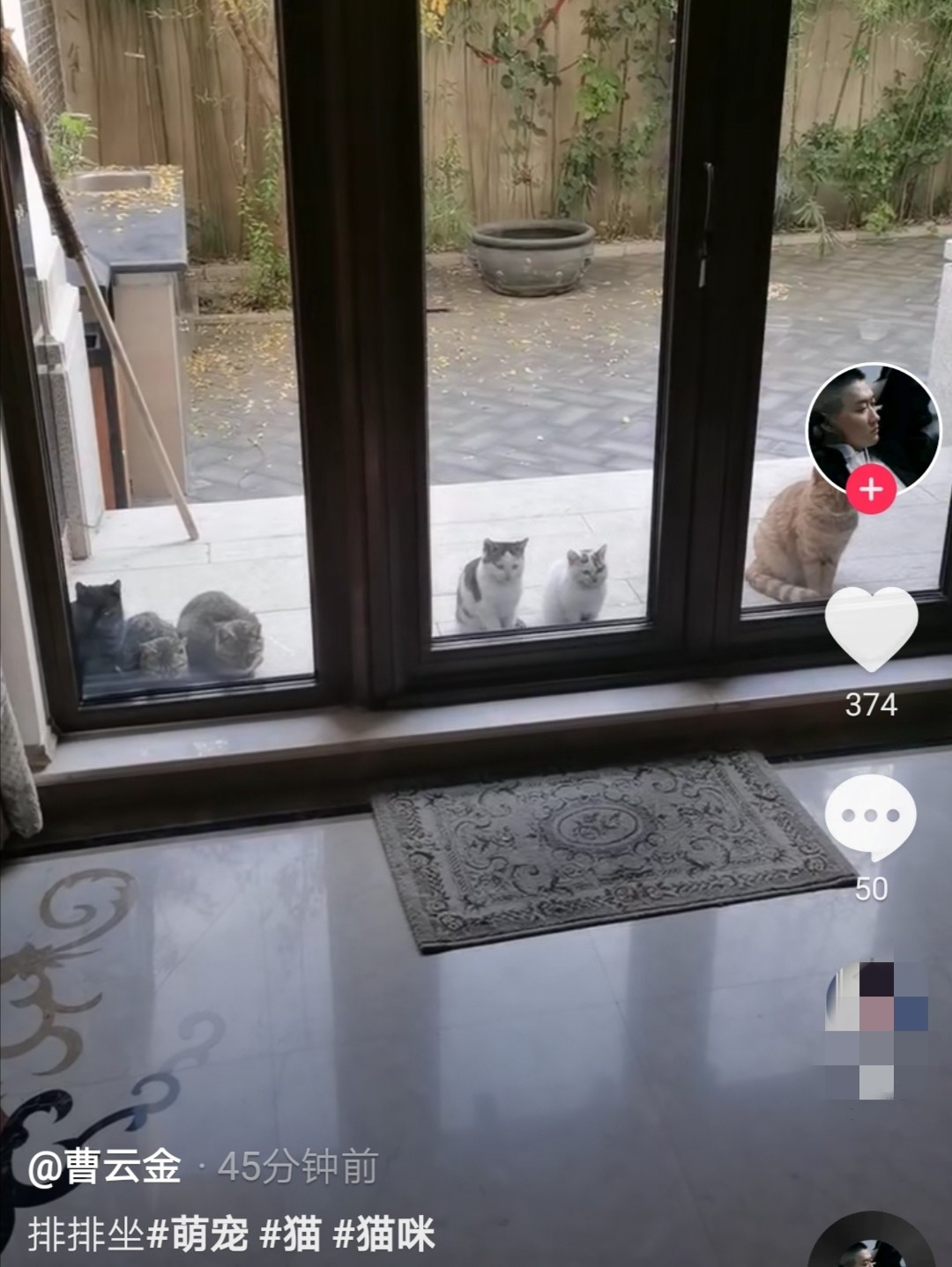 从视频中可以看到,曹云金主要想发的是自己家6只小猫,排排坐在门口的场景,他还对着这些小猫说:饿了吧,一会给你们拿吃的。