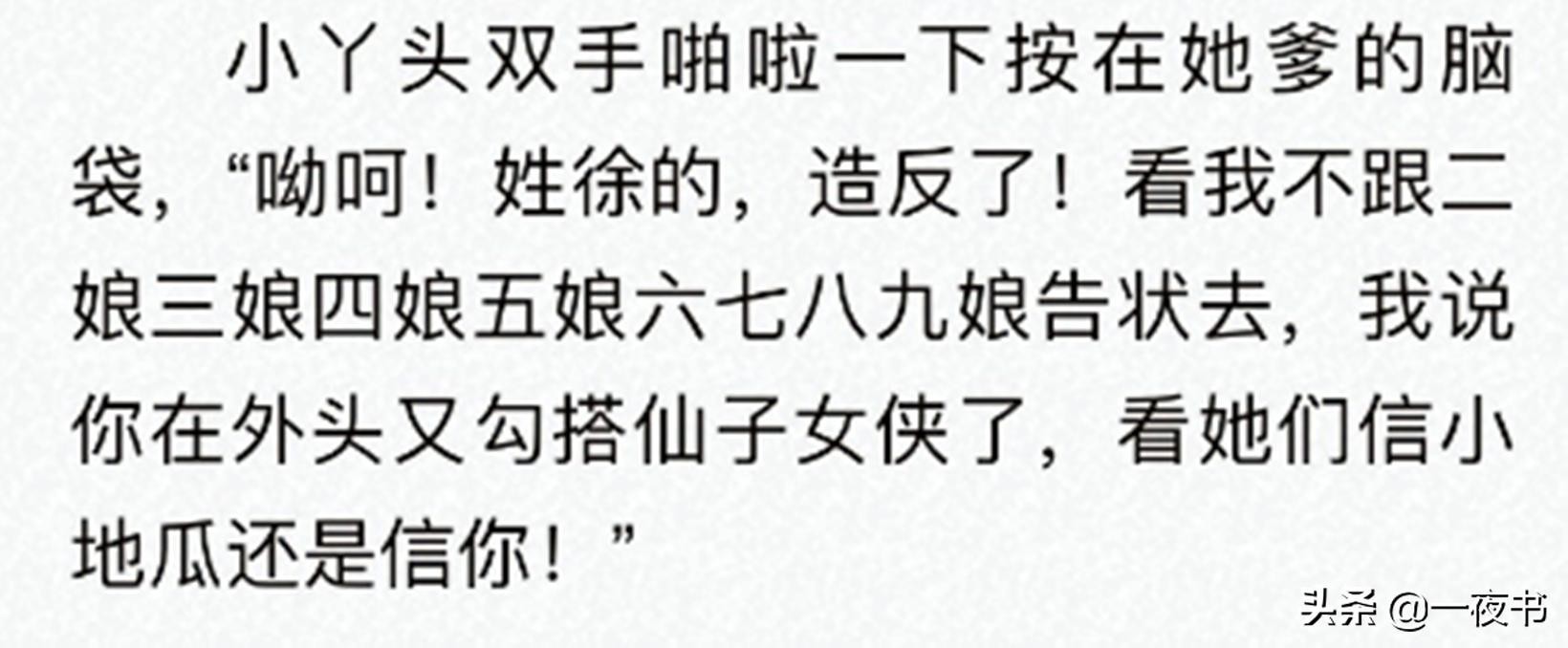 关于这个问题,其实原著中番外篇徐凤年的女儿徐念凉,也就是小地瓜实锤了。徐念凉在番外中看到徐凤年又和美女有点暧昧,曾说“呦呵,姓徐的,造反了!看我不和二娘三娘四娘五娘六七八九娘告状去,我说你在外头又勾搭仙子女侠了,看他们信小地瓜还是信你。”徐念凉的一席话令徐凤年连连告饶。
