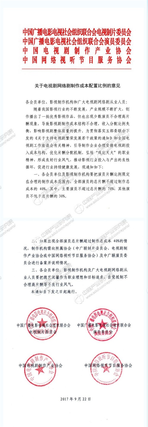 《通知》要求,现阶段严格落实已有规定,每部电影、电视剧、网络视听节目全部演员、嘉宾的总片酬不得超过制作总成本的40%,主要演员片酬不得超过总片酬的70%。《通知》提到的已有规定,是来自于2017年9月22日中国广播电影电视社会组织联合会电视制片委员会、中国广播电影电视社会组织联合会演员委员会、中国电视剧制作产业协会、中国网络视听节目服务协会联合发布的《关于电视剧网络剧制作成本配置比例的意见》。