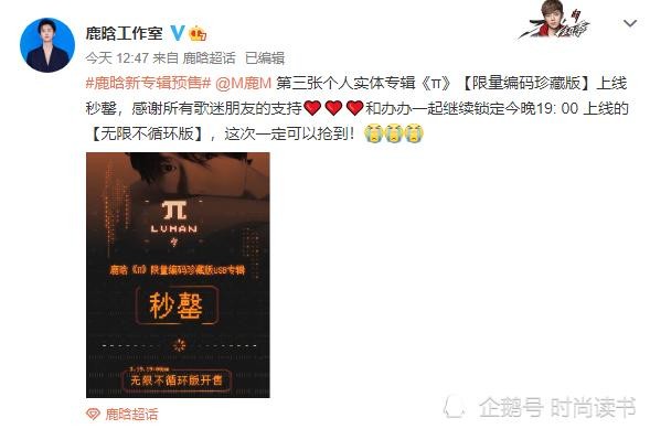 3月19日上午,鹿晗新专辑《π》预售的消息冲上微博热搜,这是鹿晗回国以来的个人第三张实体专辑,限量3万套,12:07准时上线。