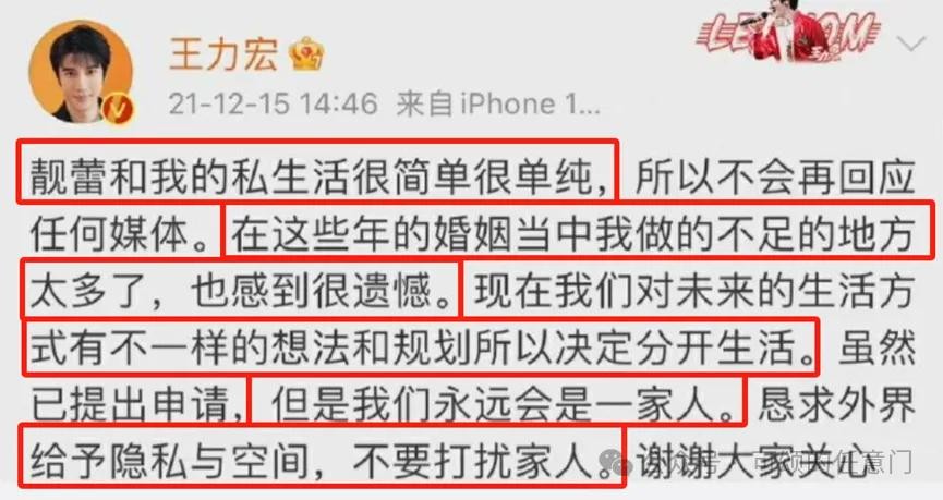2021年12月15日,台媒爆料王力宏与李靓蕾离婚。