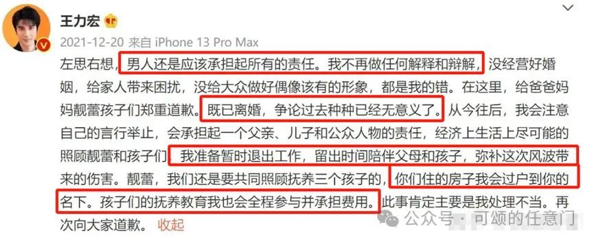 除此之外,王力宏还表示,会承担三个孩子的抚养费和教育费。