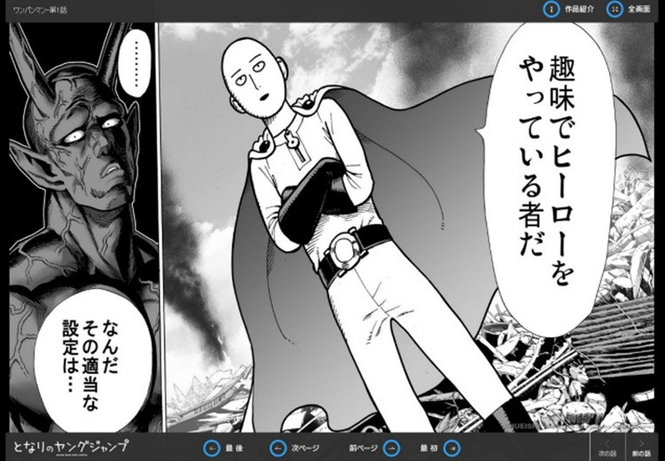 《一拳超人》最早是2009年,漫画家ONE为了练习ComicStudio(漫画软件),在投稿网站“新都社”上发表的短篇漫画,据说该作的灵感来自《面包超人》。由于《一拳》的短篇得到了许多读者的好评,所以ONE开始不定期更新这部漫画。之后随着个人方针的变化,ONE又将其改到了自己的个人网页上进行连载。虽然《一拳》的画风非常草稿,但优秀的剧情把控和动作分镜吸引了不少读者。截止2015年12月,ONE的个人网页每日访问量已经超过10万次,累计访问人数更是超过7000万。