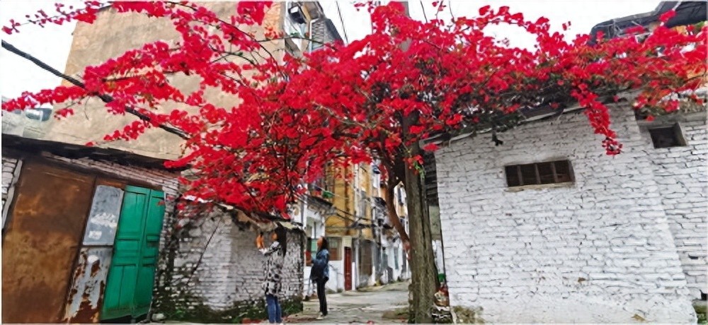 5月7日中午,记者从中山南路转入尚智巷,转过几个弯,记者一眼看到了这株三角梅,枝条上全是红色的花朵,格外灿烂夺目。它的两个主干有碗口粗,枝条主要分三个方向生长,两侧蔓延到小房的屋顶,在中间形成自然的拱门,居民每天从花拱门下经过,而往上生长的几根枝条已跟电线杆一样高。蔓延到屋顶的一些枝条垂了下来,美丽的花朵触手可及,如果把旁边白墙作为背景拍照更好看。